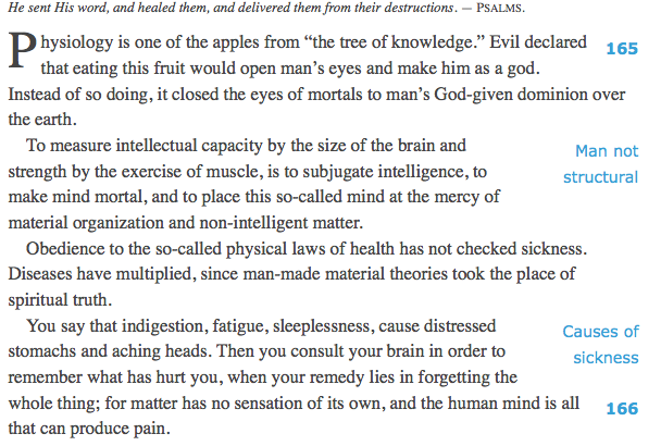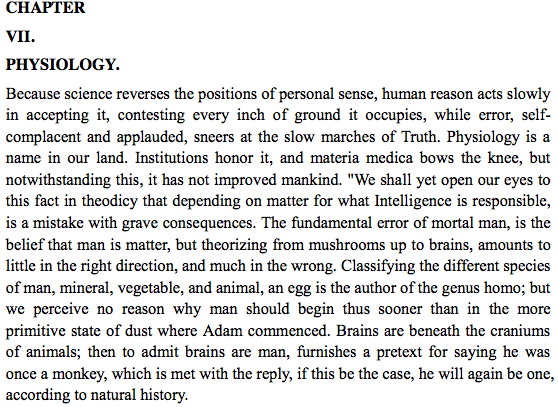 Ms. Eddy may not have been the average woman, but her chapter on Physiology shows that she is not well versed in how humans actually work (although how this is all very trivial anyway, the material body is unreal, man is spiritual, etc.). While the reasoning and prose is difficult to follow, the experts of the day thought cucumbers and melons caused cholera, so her analogy of comparing men’s brains to mushrooms isn’t too far fetched. From the first edition of Science & Health: