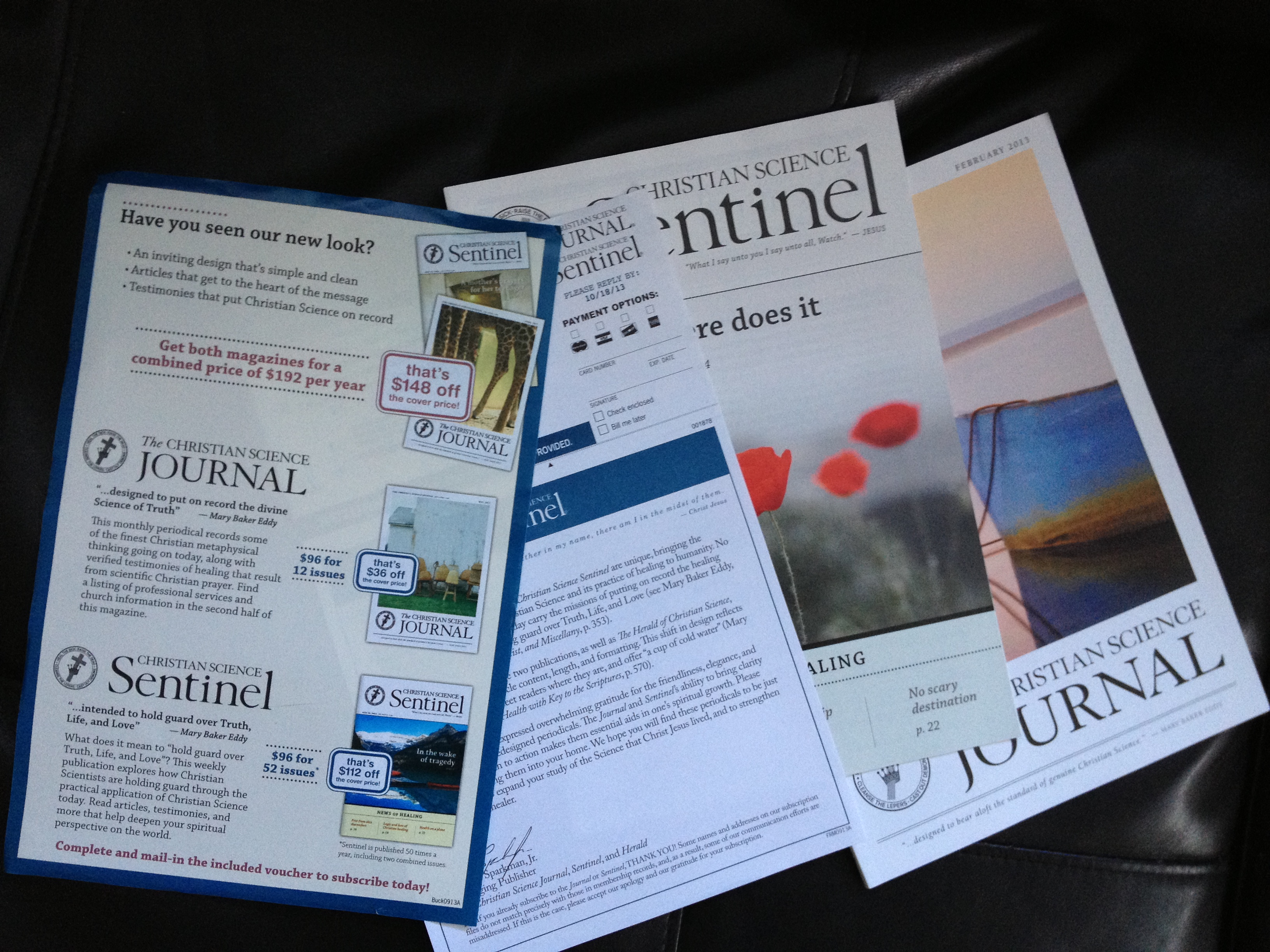 Then one day, a good three months after we’d mailed in our goodbyes, I checked the mail and found a plastic-wrapped packet of Christian Science propaganda addressed to my husband. Apparently the Church was curious if we had “seen our new look?” and had enclosed a copy of the Sentinel (from February 2013), and the Journal (also from February 2013). They had also thoughtfully enclosed a price list, with amazing offers: $148 off the cover price if you subscribe to both!