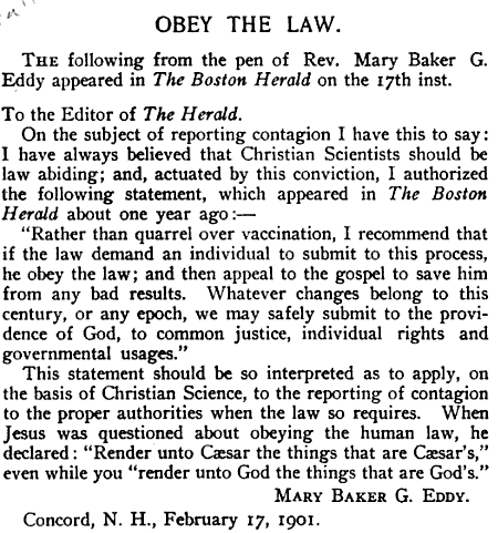 Some have interpreted this to mean that Christian Scientists should follow the law and be vaccinated, while others have argued it simply means Christian Scientists must report contagion to the proper authorities. Mary Baker Eddy teaches contagion is unreal, and Christian Science Nurses are not trained to recognize disease, so I’m not sure how this is supposed to happen (2).