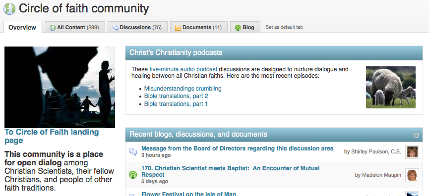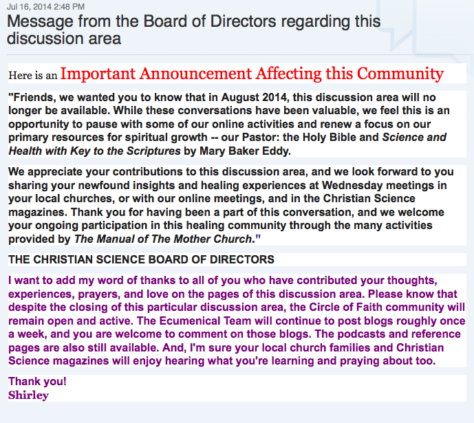 It seems the “Circle of faith” community at christianscience.com is closing down. While I never spent much time there, I did enjoy the idea that The Mother Church would permit “open idalogue among Christian Scientists, their fellow Christians, and people of other faith traditions.”